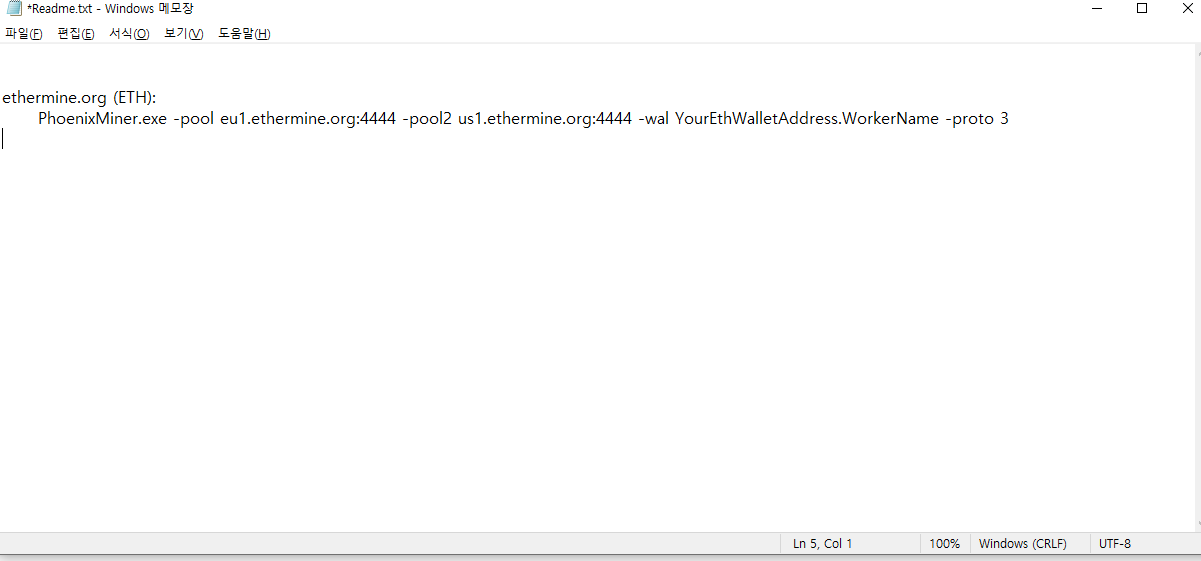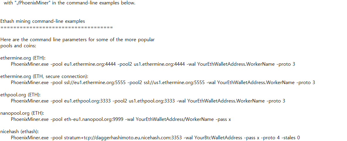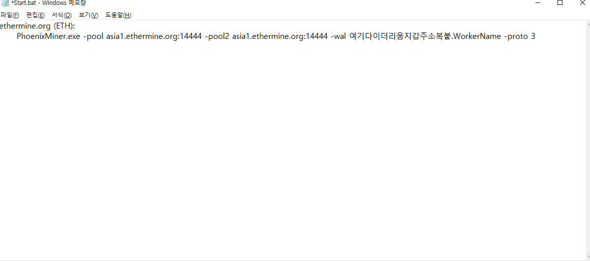 우리는 아시아서버를 사용하기 때문에 eu1, us1 대신 asia1 로 바꾸고 4444 를 14444 로 바꾼다 그리고 YourEthWalletAddress 자리에 업비트 이더리움 지갑 주소를 복사붙여넣기 한다.