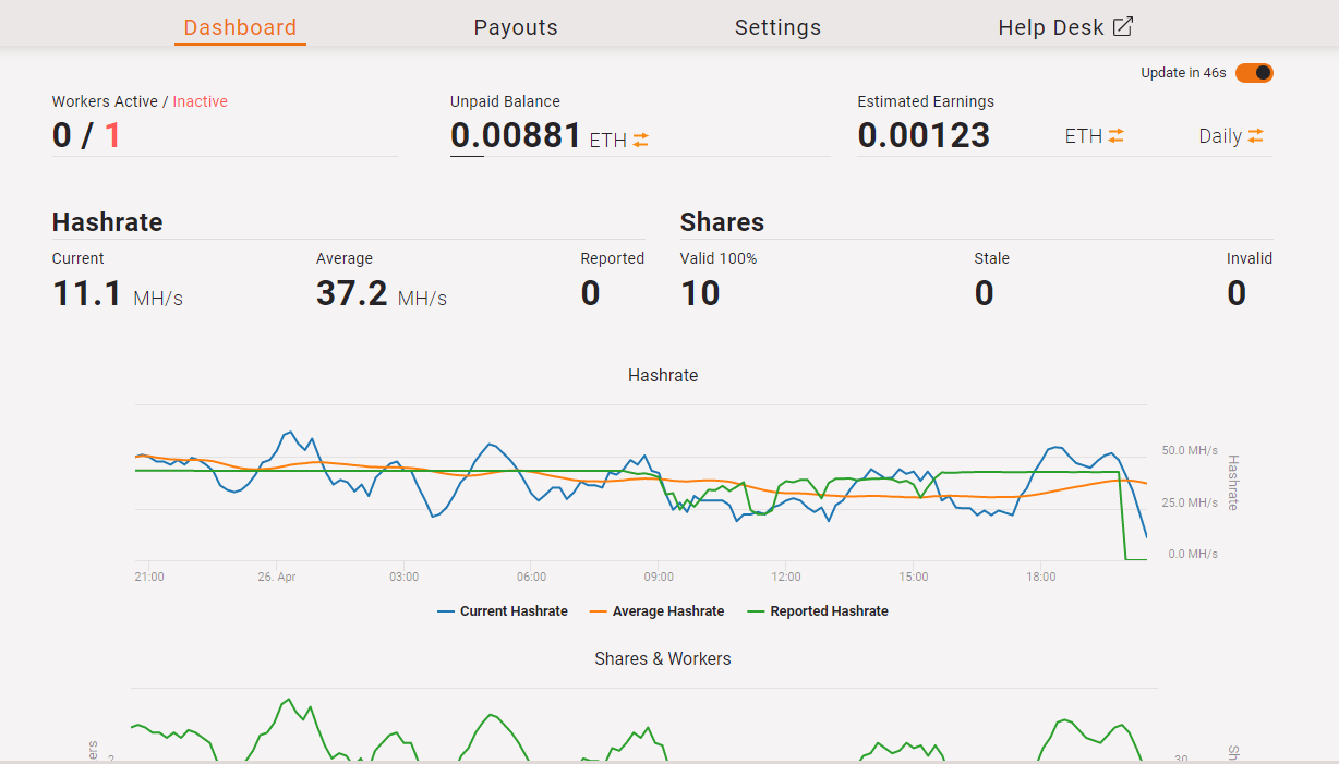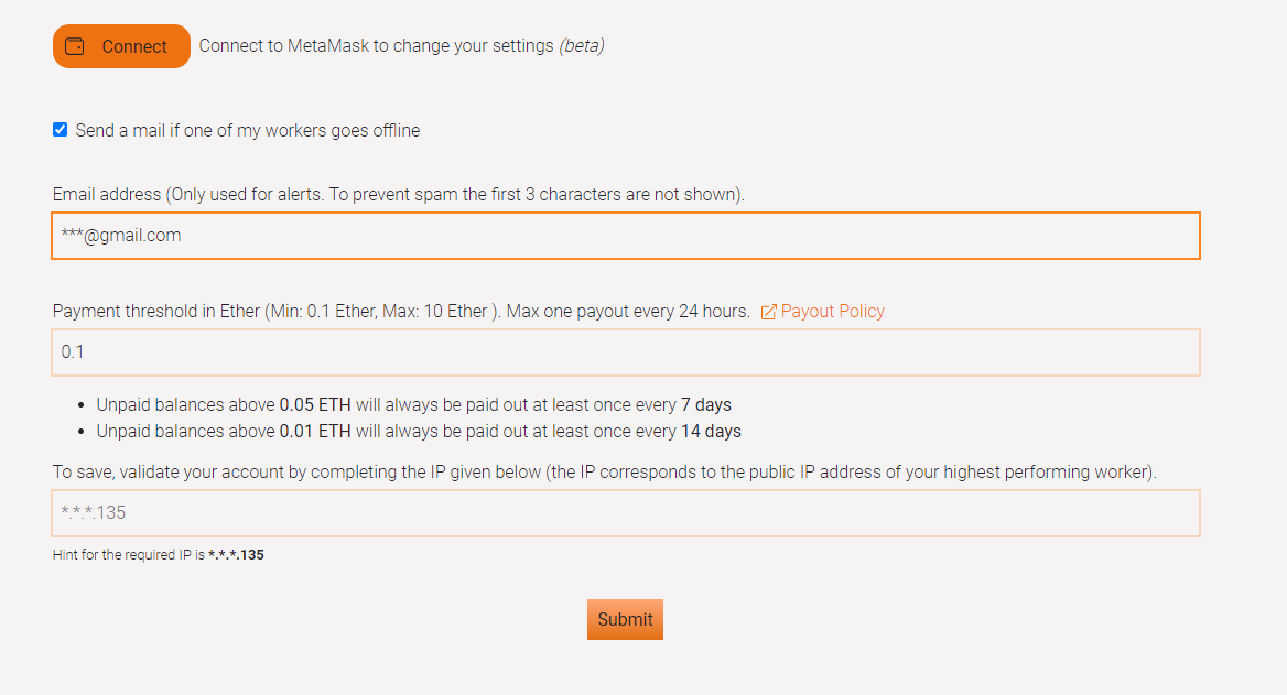 이더리움 채굴하면 unpaid balance 에 쌓이고 0.01 Eth 이 쌓일 때 마다 지갑으로 전송해준다.