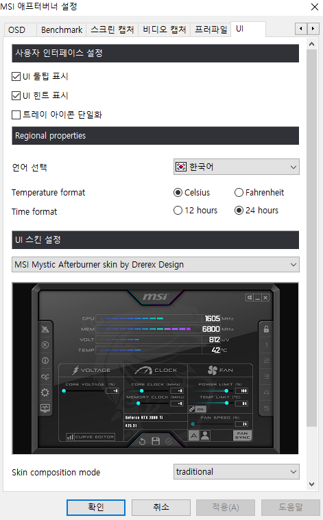 설정에 들어가서 UI 스킨을 mystic afterburner skin 으로 바꾼다.