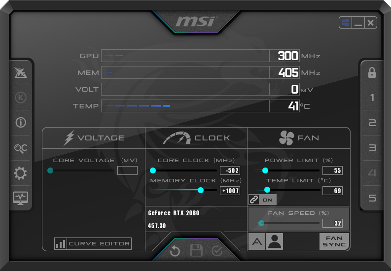 MSI Afterburner is the world’s most recognized and widely used graphics card overclocking utility. It provides detailed overview of your hardware and comes with some additional features like customizing fan profiles, benchmarking and video recording.