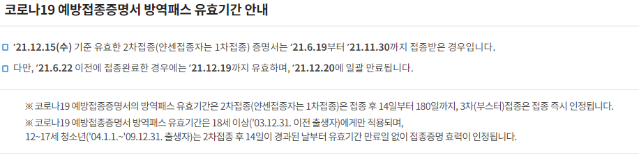 21년 6월 22일 이전에 접종 완료한 경우는 21년 12월 19일까지 유효합니다.