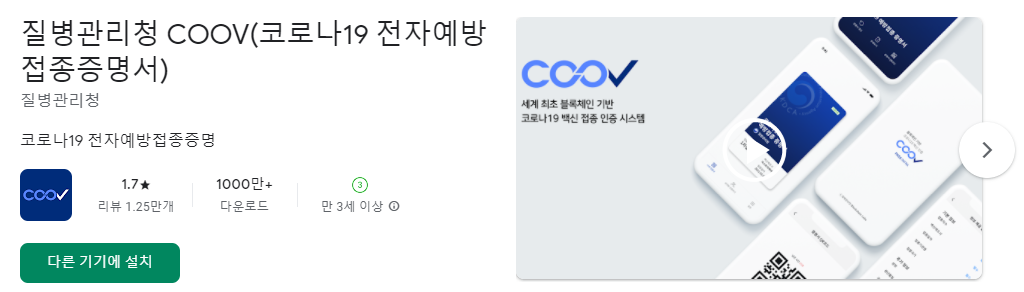 플레이 스토어에 들어가서 질병관리청 COOV 를 검색 합니다.