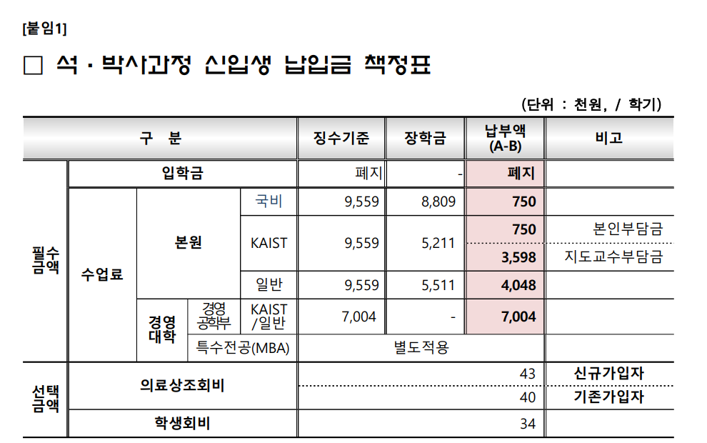 본원 수업료(경영대학은 설명하지 않겠습니다.) 를 보면 국비/카이스트/일반 장학생 구분이 되어 있습니다.