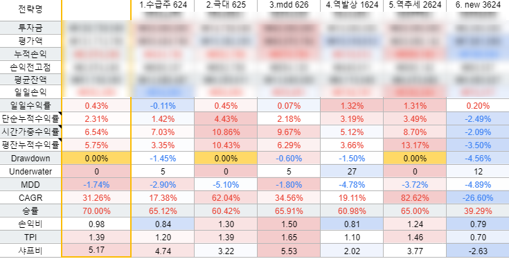소형주와 역추세 전략이 이번달을 이끌었고 새로 추가한 6번전략은 12일 연속 손해를 보고 오늘 반등하였습니다. 단순하고 다른 포트와 상관성이 낮아 소액으로 운영해 볼 계획입니다.