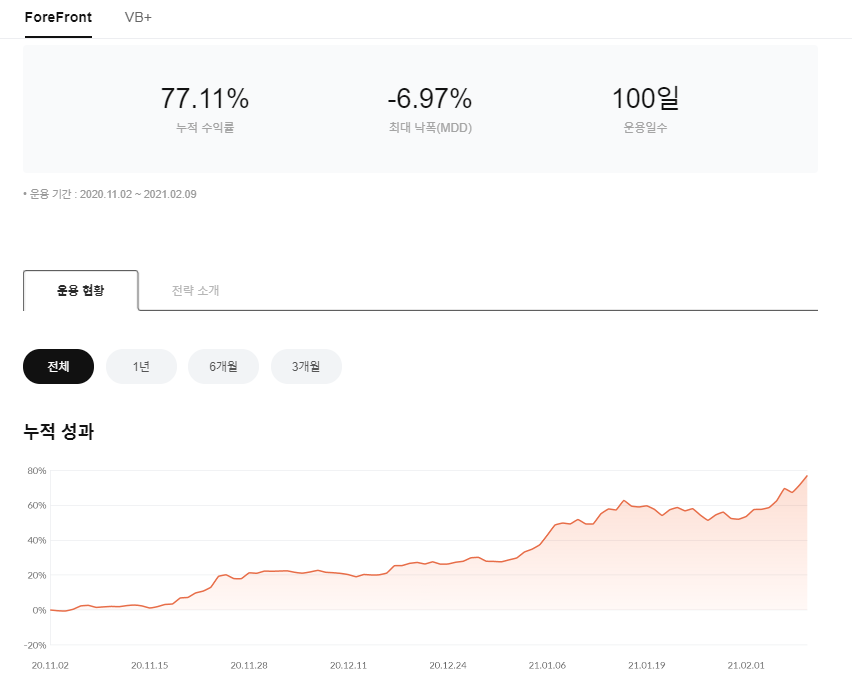 FF 전략은 운용한지 100일 밖에 되지 않았는데도 77% 최대낙폭-7% 를 기록하고 있습니다. 빠질때는 80%도 빠지는 비트코인시장에서 3달에 77% 수익보다 더 놀랍습니다.