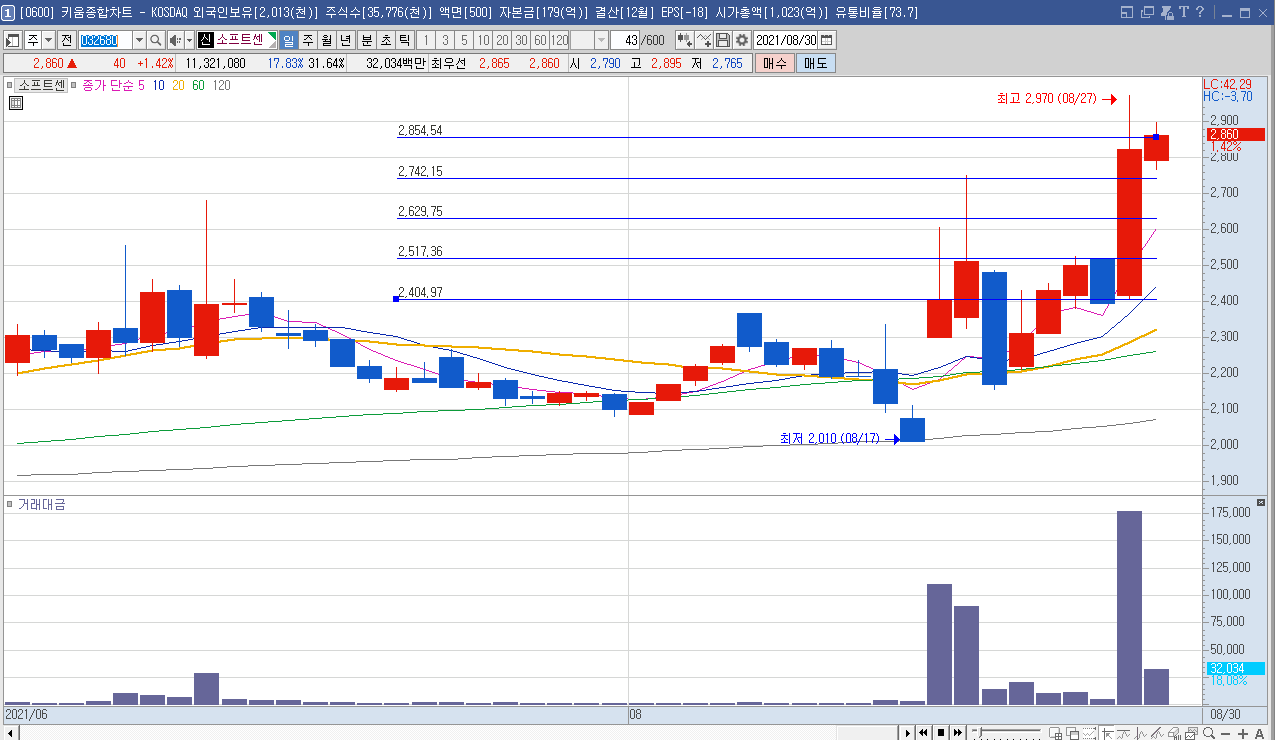 소프트센은 중국 지앙수 수촨 기술과 214억9200만원 규모의 초박막 폴더블 커버글라스 양산시스템 공급계약을 체결했다고 밝혀, 호재가 있고 수급이 들어와 2890원에 1차 매수, 손절라인 2355원