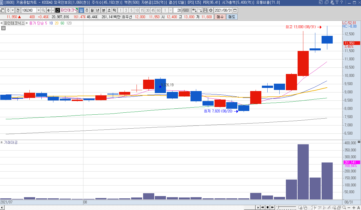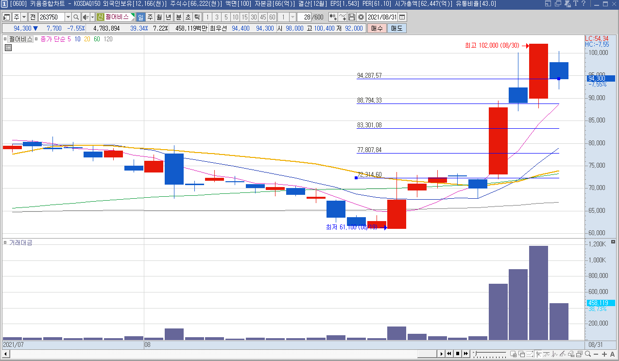 94300에 1차 진입, 게임 도깨비 가 호평을 받음. 새로운개념의 게임으로 기대감 상승. 거래대금이 높아 시장주도하는 주도주로 보임.