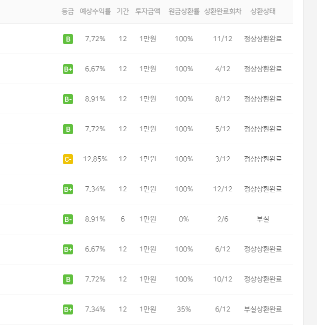 일반적으로 1년치 채권을 최소금액 1만 원으로 책정하여 그 금액이 모이면 개인신용 등으로 제공하는 형태입니다. 홈페이지 보면 평균 수익률 10% 로 분산 투자하면 안전하다 라고 하는데요. 보고 판단해보시라 제가 직접 17년 6월 첫투자를 시작해서 20년 6월 99프로 상환 완료까지 1000만 원 투자한 수익을 공개해 드리려 합니다.